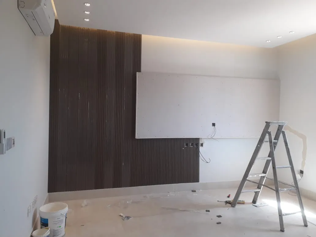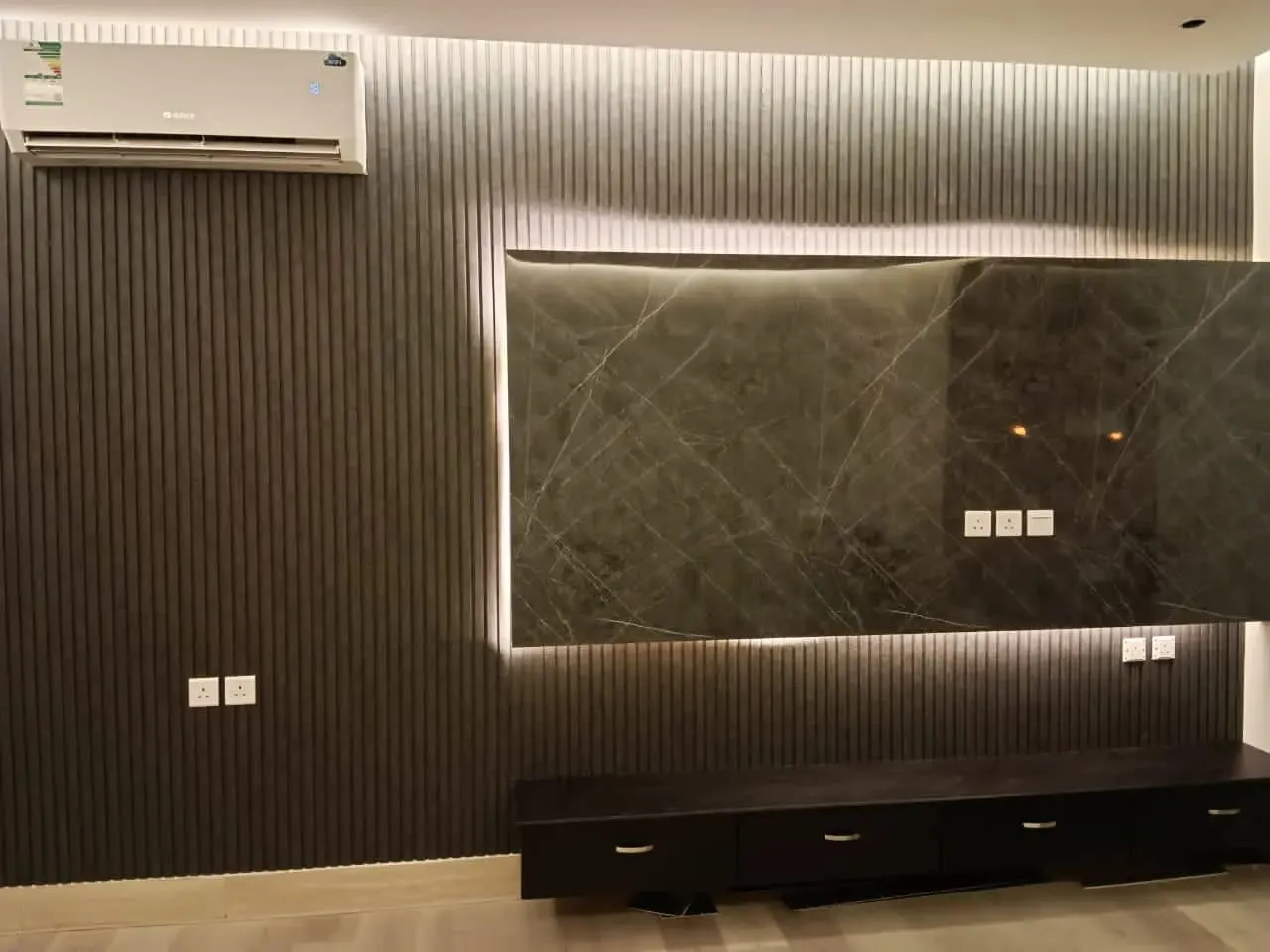 ديكورات شاشة تلفزيون باستخدام بديل الخشب