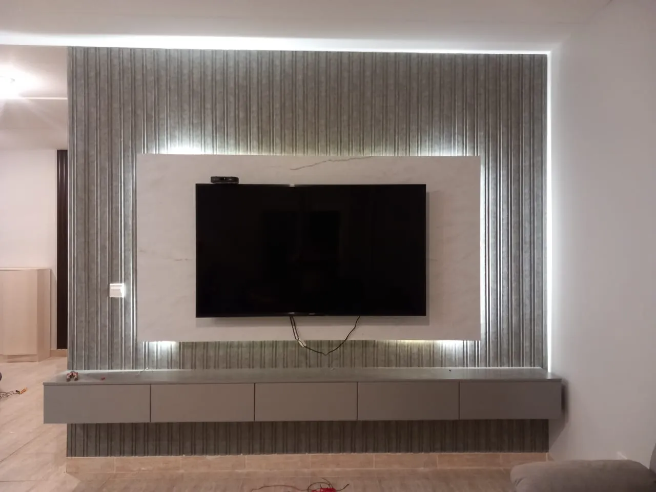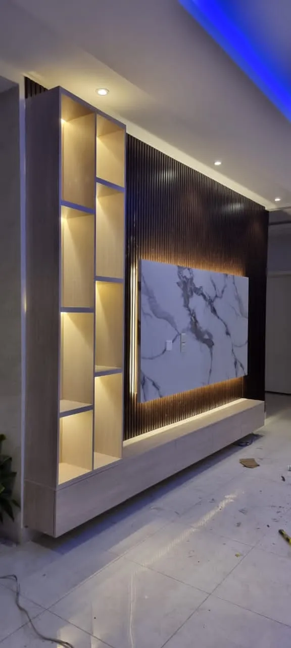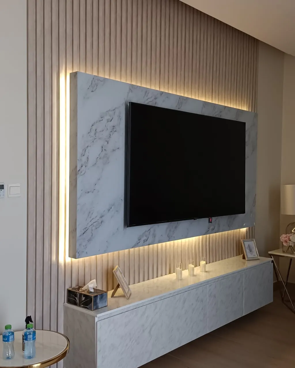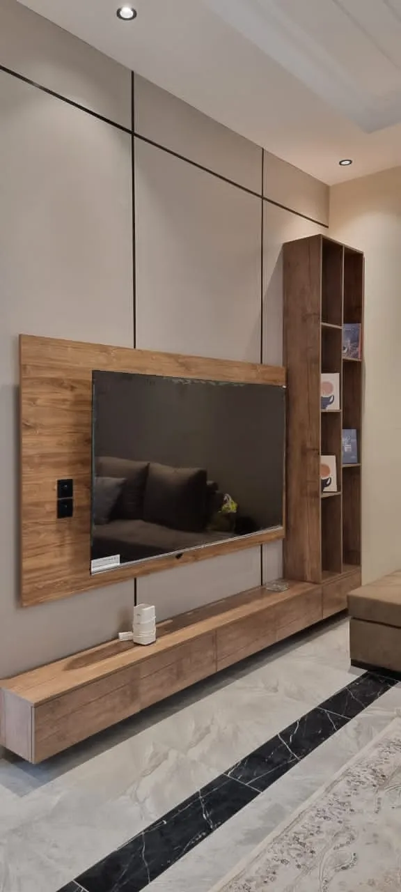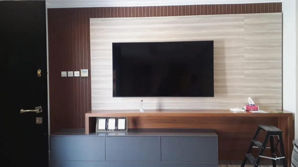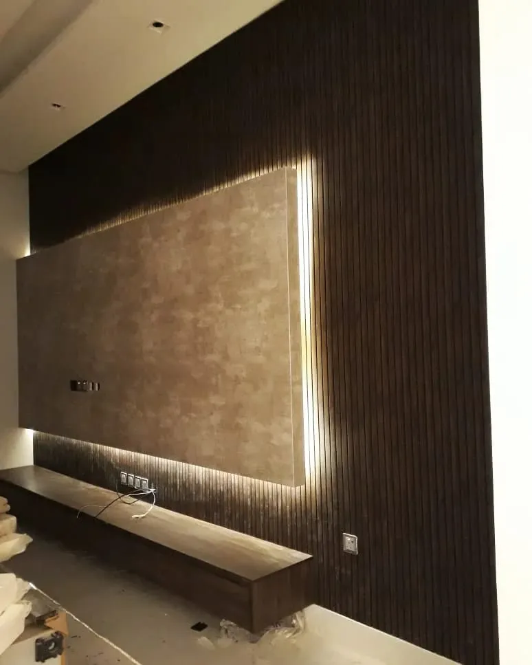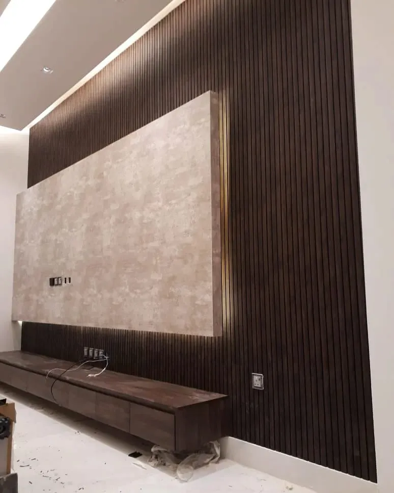 ديكورات شاشة تلفزيون باستخدام بديل الخشب