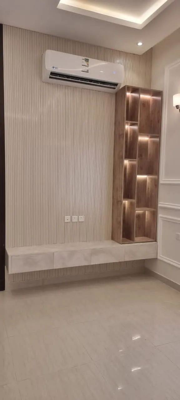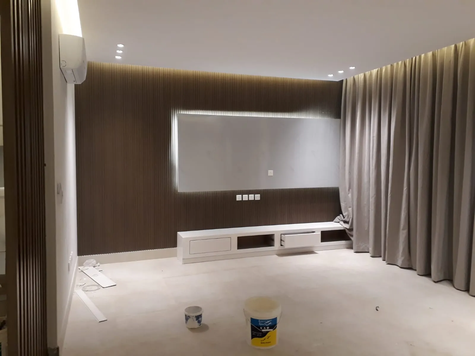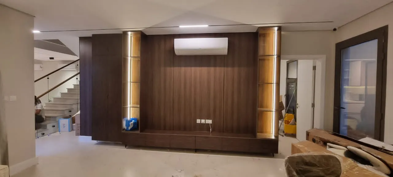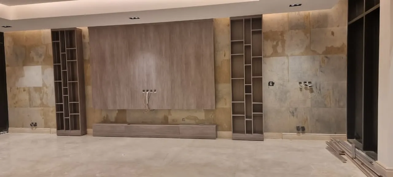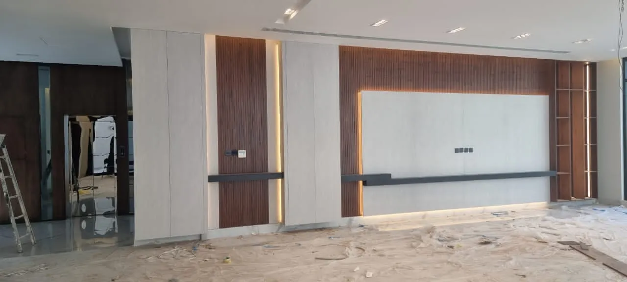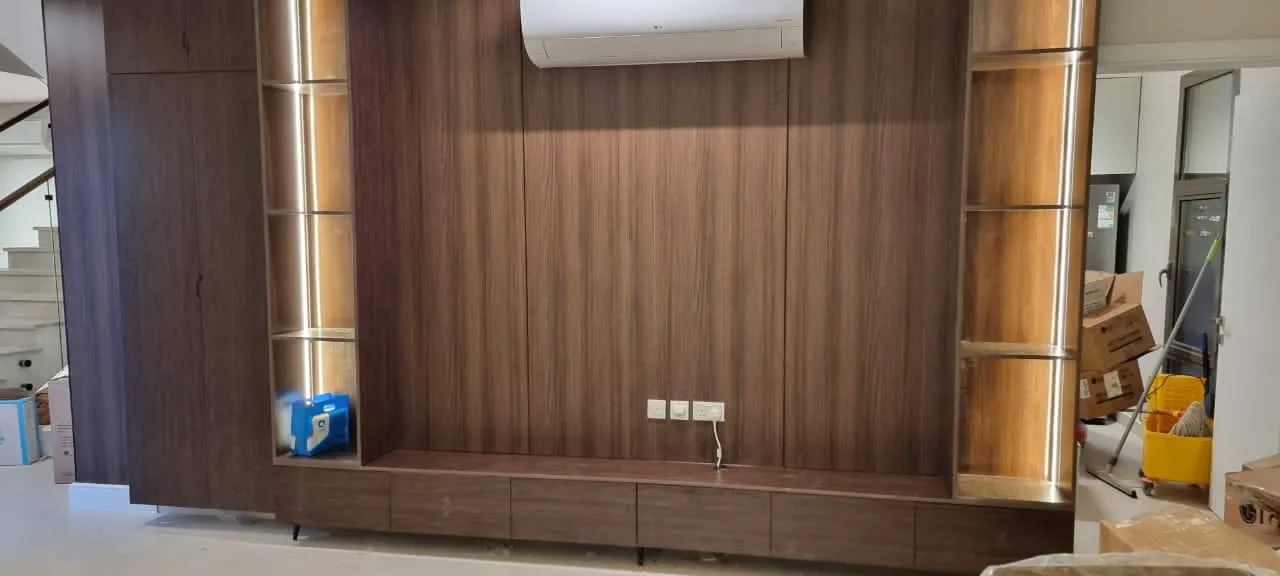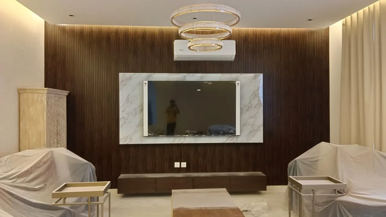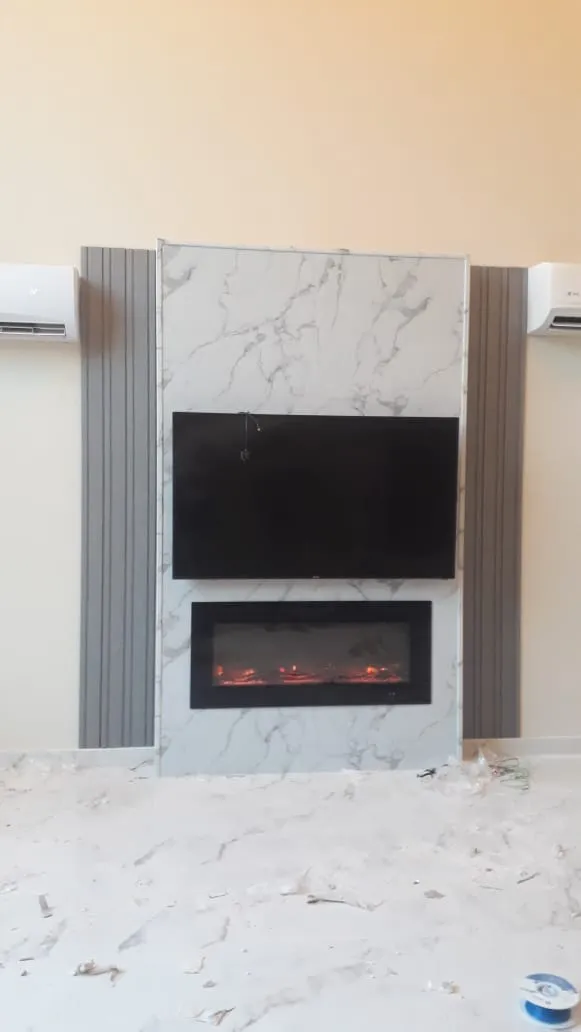 ديكورات شاشة تلفزيون باستخدام بديل الخشب